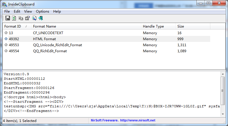 接下来给大家说一下实现的原理,其实所有的秘密都在Windows的剪贴板中,先给大家介绍一个查看剪贴板数据的工具:InsideClipboard,打开这个工具,当你复制QQ中的图文信息的时候,你会在InsideClipborad中看到如下信息: